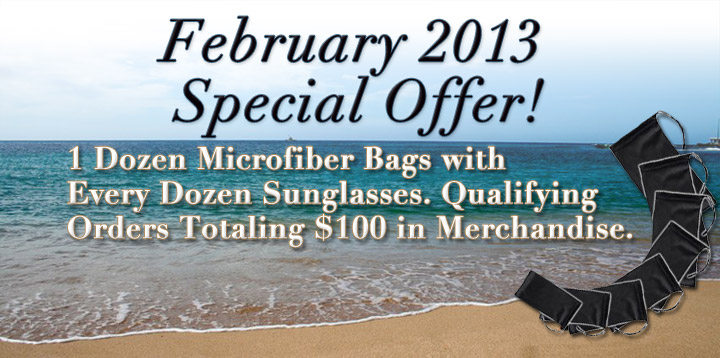 During the month of February 2013 CTS will be giving customers a dozen of Microfiber Bags with every dozen of sunglasses ordered! To qualify for this special promotional offer, just place an order totaling $100 or more of merchandise, and for every dozen sunglasses within your order, you will receive a complimentary dozen Microfiber Bags! Whether you are ordering baseball caps, lighters or any other of the hundreds of products available via our online store, if your order total reaches $100 (prior to shipping and handling) you will receive these complimentary microfiber bags for each dozen sunglasses you have ordered.